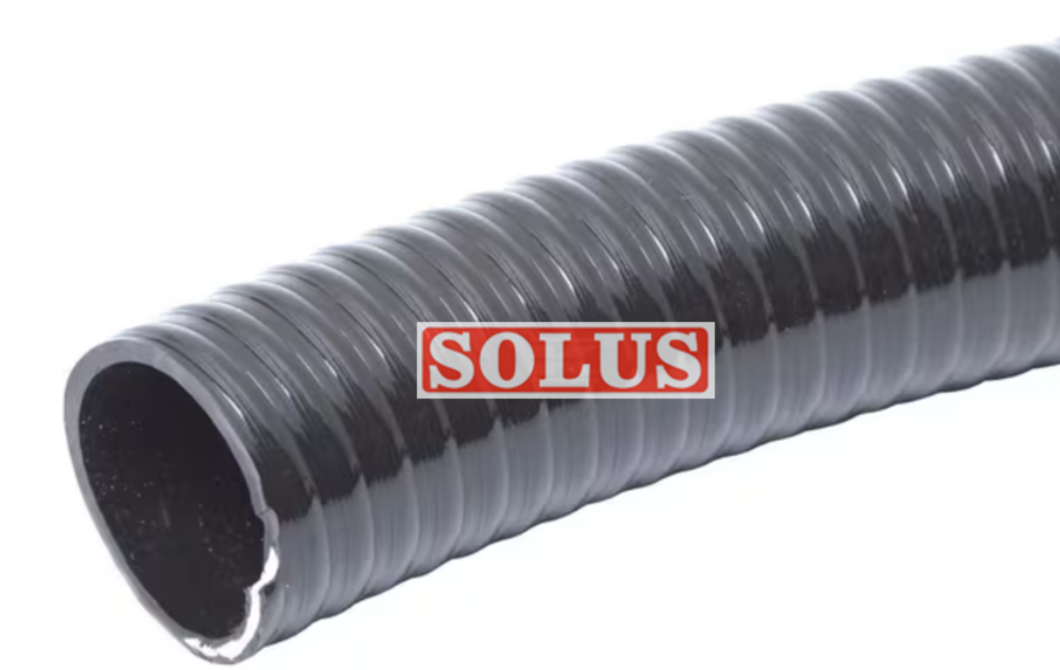 Material: Black PVC with an embedded rigid white PVC spiral. Smooth interior, corrugated exterior. Shore A: 48.